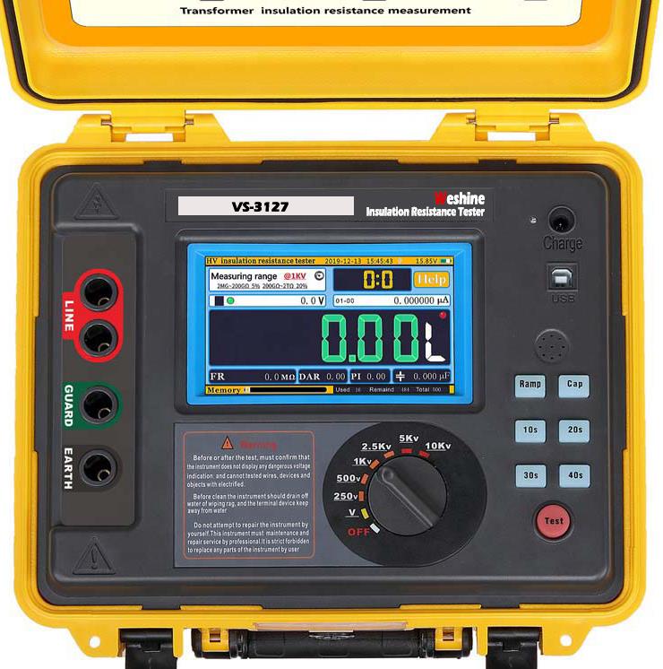 Weshine® VS-3127 はバッテリー駆動です変圧器の絶縁試験デジタルおよびアナログのアーク ディスプレイを備え、ケーブル、回転プラント機械、変圧器、開閉装置および産業用アプリケーションのメンテナンスおよび保守における高電圧絶縁抵抗試験用に設計されています。